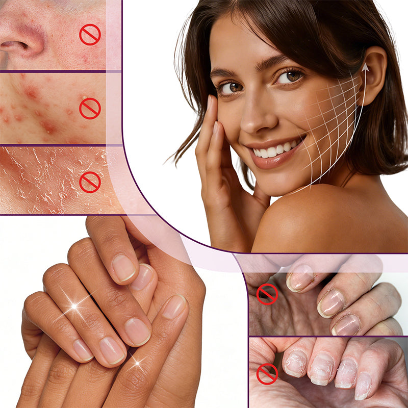 - Strengthens Hair and Nails: Encourages healthier, stronger hair growth and helps to reduce brittle nails, giving you a polished look from within.